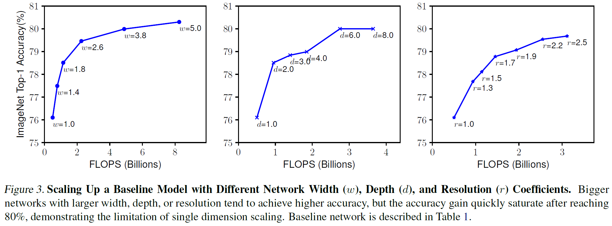 depth를 2배하면 flops가 2배로 증가한다. 반면 width와 resolution을 2배 증가하면 4배 증가하기 때문에
