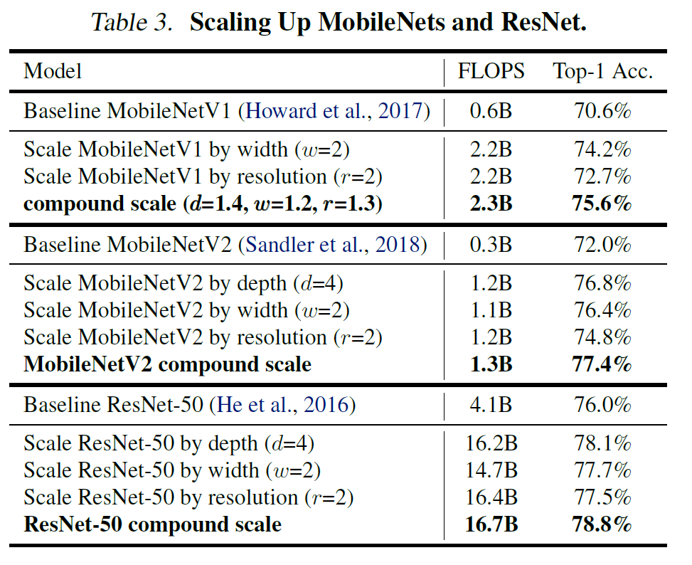 MobileNet과 ResNet에 Compound Scale을 적용한 결과, 기존의 FLOPS와 유사하면서 정확도가 증가한 것을 볼 수 있다.